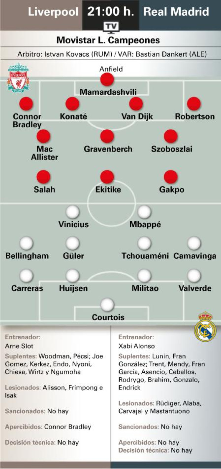 Los Blancos are without Dani Carvajal, Antonio Rudiger and David Alaba, while Franco Mastantuono was ruled out late on with a groin injury. For their part, Liverpool be without Alisson Becker, Alexander Isak and Jeremie Frimpong, as confirmed by Arne Slot.