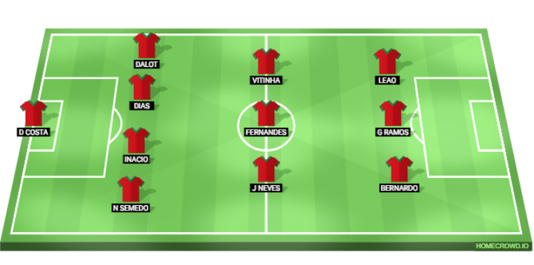 Probable Lineup (4-3-3): D Costa; N Semedo, Inacio, Dias, Dalot; J Neves, Fernandes, Vitinha; Bernardo, G Ramos, Leao