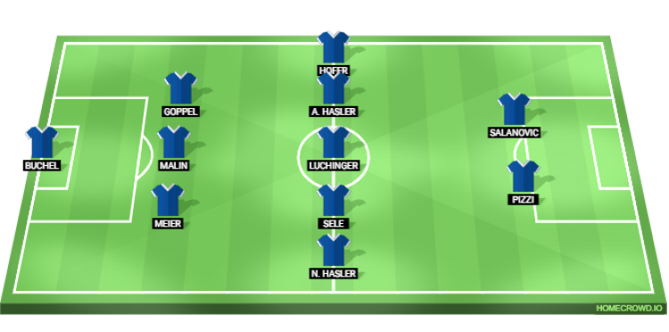 Nicolas Hasler and Jens Hofer will feature as the wing-backs, while Simon Luchinger, Aron Sele, and Alessio Hasler will form the midfield trifecta. The trio will certainly have a lot of defending to do, and they will protect the centre-backs.