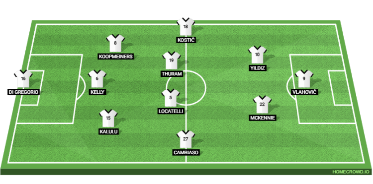 Probable Lineup (3-4-2-1): Di Gregorio; Kalulu, Kelly, Koopmeiners; Cambiaso, Locatelli, Thuram, Kostic; McKennie, Yildiz; Vlahovic