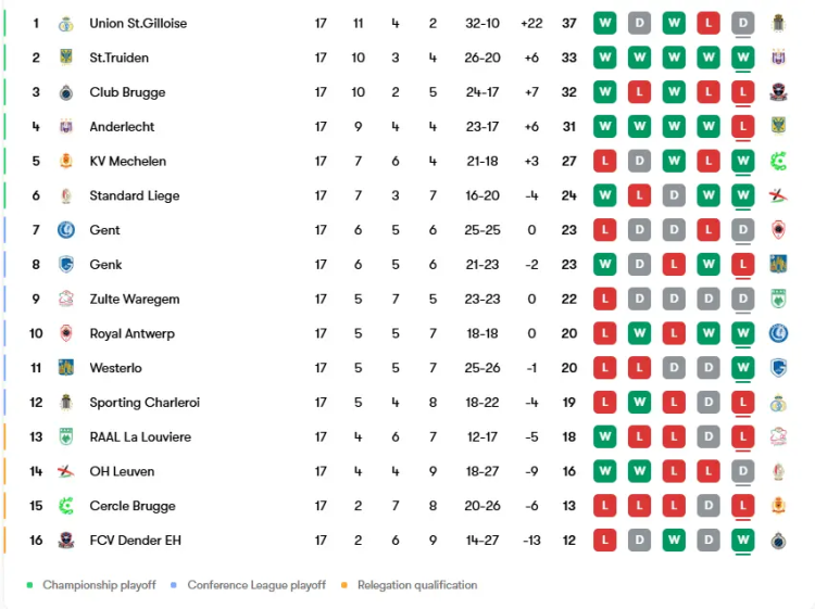 Club Brugge were unable to take advantage of Union’s slip up. They lost 3-2 away to Sint Truiden in the game of the weekend. Raphael Onyedika gave Club the lead just after the 15 minute mark, only for Arbnor Muja to get the Canaries back on level terms. Ryotaro Ito then converted a penalty conceded by Brandon Mechele. Sint Truiden had plenty of chances on the break but were undone by Club’s pressure when Kaye Furo equalised. Andres Ferrari came on almost immediately after and his acrobatic winner in the 81st minute moved Sint Truiden into second place in the table.
