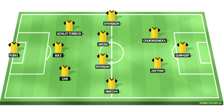 Julian Ryerson and Daniel Svensson will provide significant support to the backline, as the duo are expected to feature as wing-backs. Meanwhile, Pascal Gross should partner with Felix Nmecha in the centre of the park.