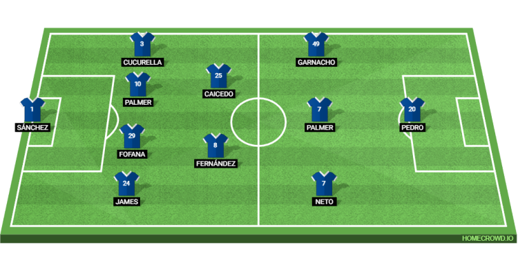 Predicted Chelsea XI: Sanchez; James, Fofana, Chalobah, Cucurella; Fernandez, Caicedo; Neto, Palmer, Garnacho; Joao Pedro