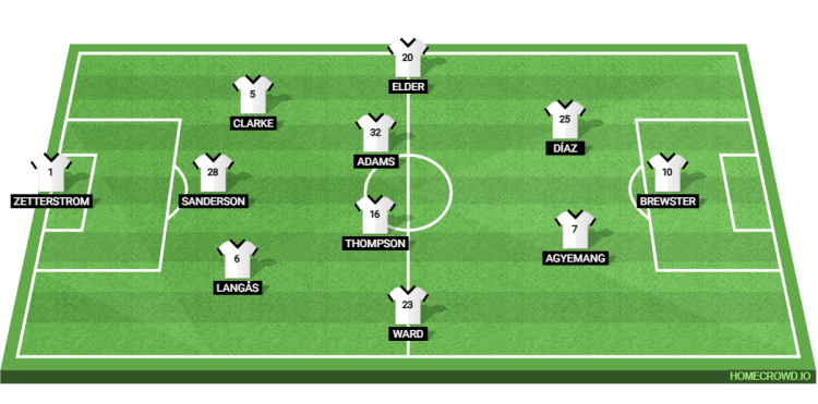 Probable Lineup (3-4-2-1): Zetterstrom; Langas, Sanderson, Clarke; Ward, Thompson, Adams, Elder; Diaz, Agyemang; Brewster