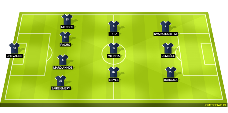 Probable Lineup (4-3-3): Chevalier; Zaire-Emery; Marquinhos, Pacho, Mendes; Neves, Vitinha, Neves; Barcola, Dembele, Kvaratskhelia