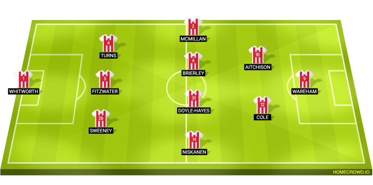 Probable Lineup (3-4-2-1): Whitworth; Sweeney, Fitzwater, Turns; Niskanen, Doyle-Hayes, Brierley, McMillan; Cole, Aitchison; Wareham