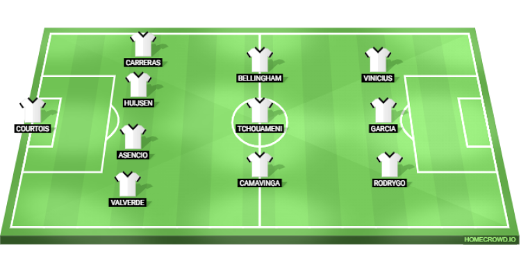Probable Lineup (4-3-3): Courtois; Valverde, Asencio, Huijsen, Carreras; Camavinga, Tchouameni, Bellingham; Rodrygo, Garcia, Vinicius Junior