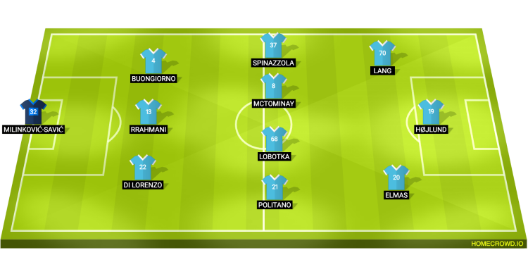 Probable Lineup (3-4-3): Milinkovic-Savic; Di Lorenzo, Rrahmani, Buongiorno; Politano, Lobotka, McTominay, Spinazzola; Elmas, Lang; Hojlund