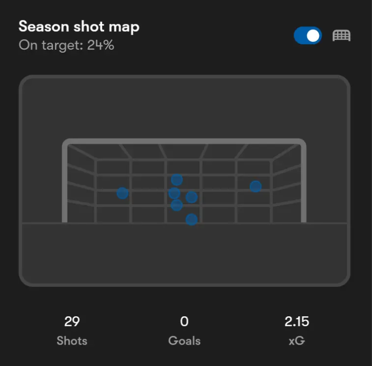 From this season’s shot map, it is clear that he needs to better his 24% on-target rate and make more use of his rather impressive average of 5.86 touches per 90 in opponents’ penalty areas. This previously undernourished stat can come down to a lack of selfishness (i.e. a love for an assist), or may be affected by confidence and composure when faced with scoring opportunities.