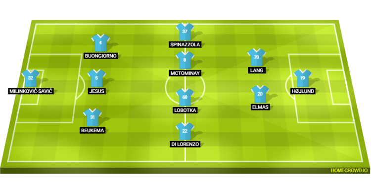 Probable Lineup (3-4-2-1): Milinkovic-Savic; Beukema, Jesus, Buongiorno; Di Lorenzo, Lobotka, McTominay, Spinazzola; Elmas, Lang; Hojlund
