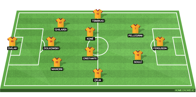 Probable Lineup (3-4-2-1): Svilar; Mancini, Ziolkowski, Ghilardi; Celik, Cristante, Pisilli, Tsimikas; Soule, Pellegrini; Ferguson