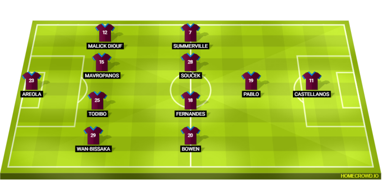 Probable Lineup (4-4-1-1): Areola; Wan-Bissaka, Todibo, Mavropanos, Diouf; Bowen, Fernandes, Soucek, Summerville; Pablo; Castellanos