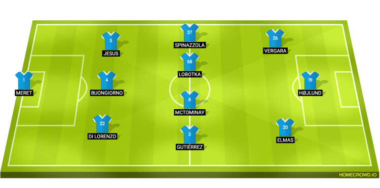Probable Lineup (3-4-3): Meret; Di Lorenzo, Buongiorno, Jesus; Gutierrez, McTominay, Lobotka, Spinazzola; Elmas, Hojlund, Vergara