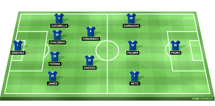 Predicted Chelsea XI: Sanchez; James, Fofana, Chalobah, Cucurella; Caicedo, Fernandez; Neto, Palmer, Garnacho; Pedro