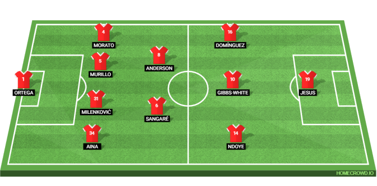 Probable Lineup (4-2-3-1): Ortega; Aina, Milenkovic, Murillo, Morato; Sangare, Anderson; Ndoye, Gibbs-White, Dominguez; Jesus