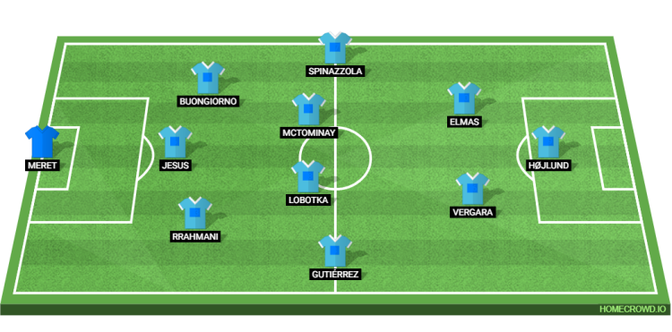 Probable Lineup (3-4-2-1): Meret; Rrahmani, Jesus, Buongiorno; Gutierrez, Lobotka, McTominay, Spinazzola; Vergara, Elmas; Hojlund