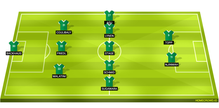 Probable Lineup (3-5-2): Backhaus; Malatini, Friedl, Coulibaly; Sugawara, Schmid, Stage, Lynen, Agu; Njinmah, Topp