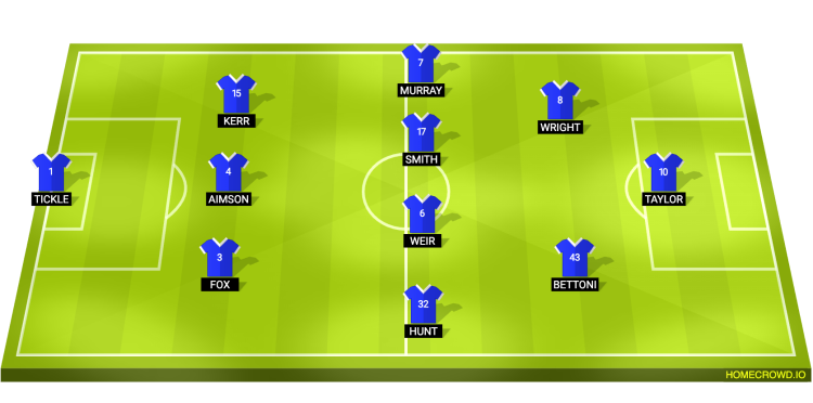 Probable Lineup (3-4-2-1): Tickle; Fox, Aimson, Kerr; Hunt, Weir, Smith, Murray; Bettoni, Wright; Taylor