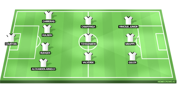 The team in white are expected to line up in a 4-3-3 formation, where Thibaut Courtois will be in goal. Trent Alexander-Arnold and Alvaro Carreras will feature as the full-backs, while Antonio Rudiger should pair up with Dean Huijsen in the heart of the defence.