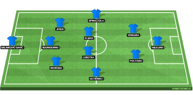 Probable Lineup (3-4-2-1): Milinkovic-Savic; Beukema, Buongiorno, Jesus; Gutierrez, Lobotka, Elmas, Spinazzola; Politano, Vergara; Hojlund