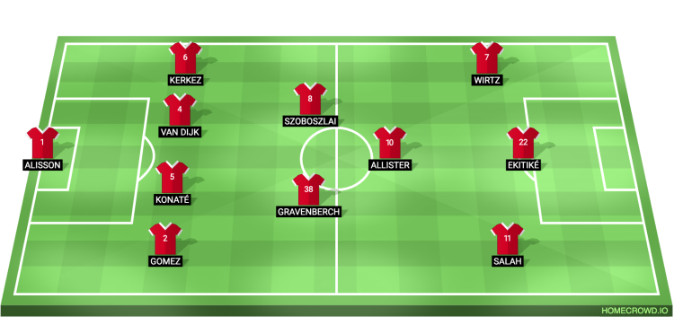 Probable Lineup (4-2-3-1): Alisson; Gomez, Konate, van Dijk, Kerkez; Gravenberch, Szoboszlai; Salah, Mac Allister, Wirtz; Ekitike