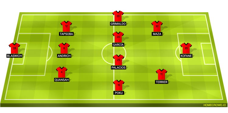 Probable Lineup (3-4-2-1): Blaswich; Quansah, Andrich, Tapsoba; Poku, Palacios, García, Grimaldo; Terrier, Maza; Kofane