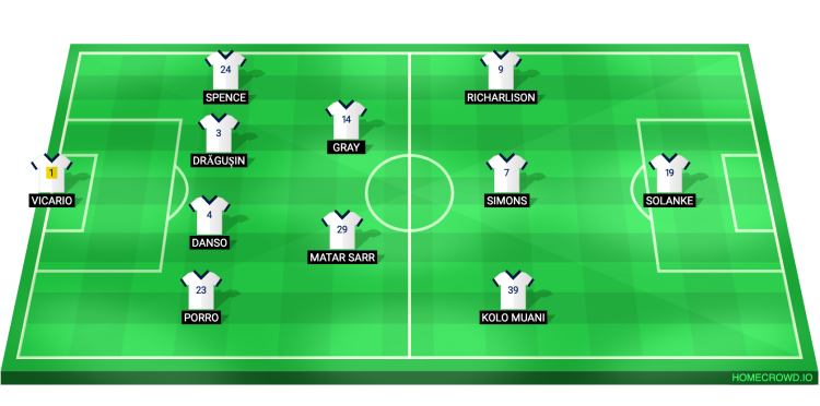 Probable Lineup (4-2-3-1): Vicario; Porro, Danso, Dragusin, Spence; Sarr, Gray; Richarlison, Simons, Kolo Muani; Solanke