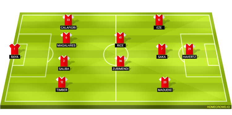 Predicted Arsenal XI: Raya; Timber, Saliba, Gabriel, Calafiori; Zubimendi, Rice; Madueke, Saka, Eze; Havertz