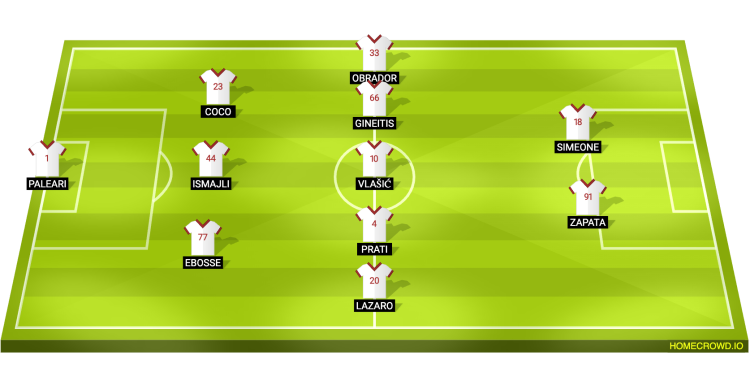 Probable Lineup (3-5-2): Paleari; Ebosse, Ismajli, Coco; Lazaro, Prati, Vlasic, Gineitis, Obrador; Zapata, Simeone