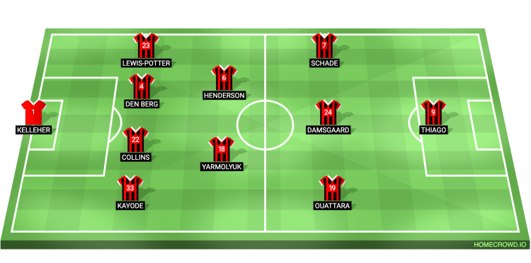 Probable Lineup (4-2-3-1): Kelleher; Kayode, Collins, van den Berg, Lewis-Potter; Yarmolyuk, Henderson; Ouattara, Damsgaard, Schade; Thiago
