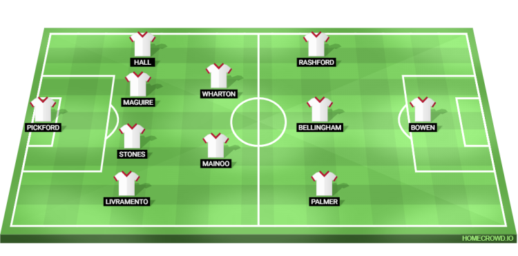 Probable Lineup (4-2-3-1): Pickford; Livramento, Stones, Maguire, Hall; Mainoo, Wharton; Palmer, Bellingham, Rashford; Bowen