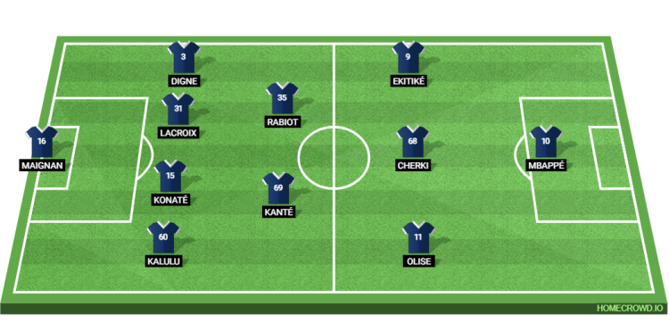 Probable Lineup (4-2-3-1): Maignan; Kalulu, Konate, Lacroix, Digne; Kante, Rabiot; Olise, Cherki, Ekitike; Mbappe