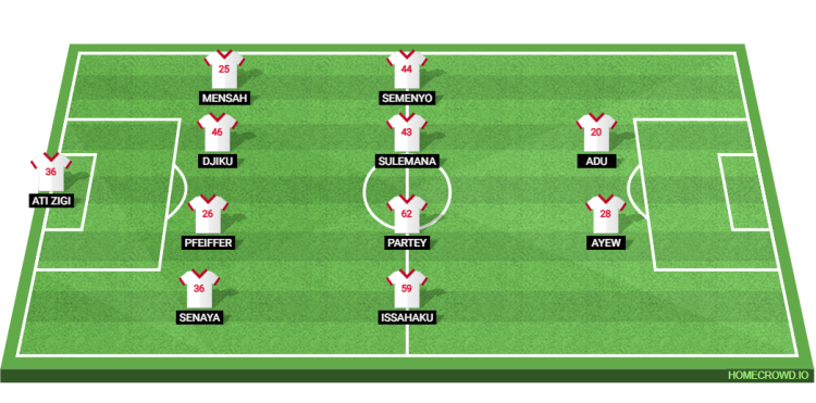 Probable Lineup (4-4-2): Ati Zigi; Senaya, Pfeiffer, Djiku, Mensah; Issahaku, Partey, Sulemana, Semenyo; Adu, Ayew