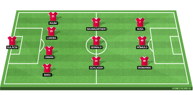 Probable Lineup (4-3-3): Gulacsi; Baku, Orban, Lukeba, Raum; Schlager, Seiwald, Baumgartner; Diomande, Romulo, Nusa