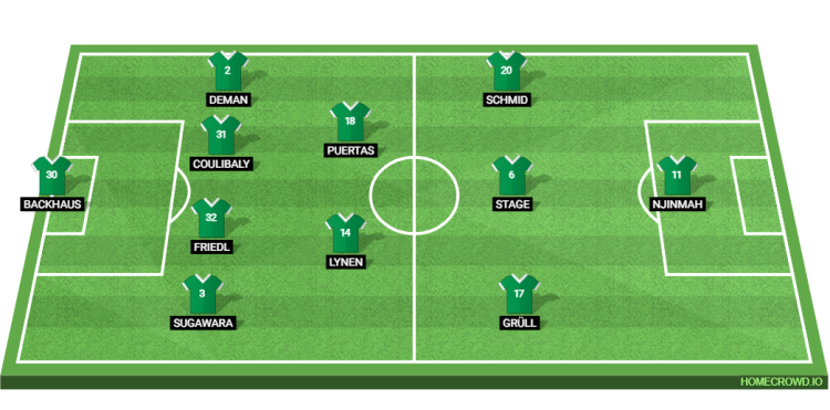Probable Lineup (4-2-3-1): Backhaus; Sugawara, Friedl, Coulibaly, Deman; Lynen, Puertas; Grull, Stage, Schmid; Njinmah