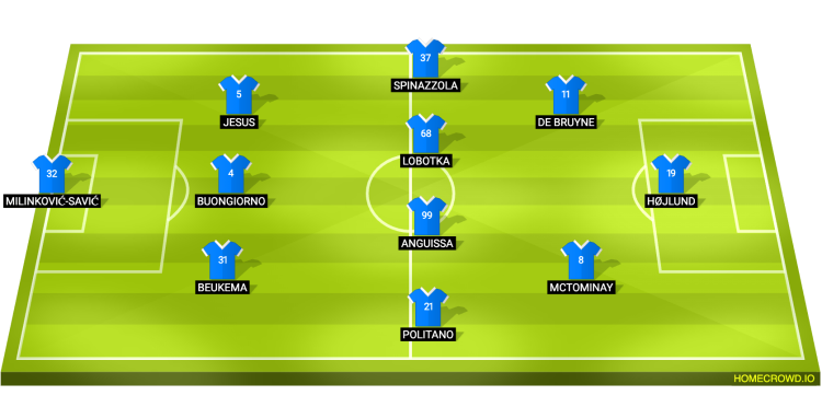 Probable Lineup (3-4-2-1): Milinkovic-Savic; Beukema, Buongiorno, Jesus; Politano, Anguissa, Lobotka, Spinazzola; McTominay, De Bruyne; Hojlund