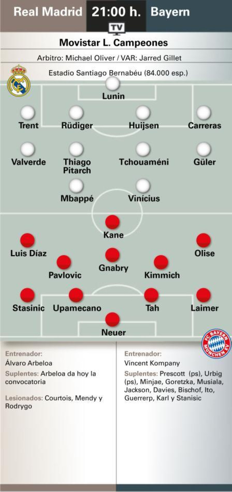 Real Madrid host Bayern Munich at the Santiago Bernabeu (21:00 CEST) for the first leg of their Champions League quarter-final on Tuesday night, with the return at the Allianz Arena on the 15th of April next week. Real Madrid manager Alvaro Arbeloa has two major doubts over his starting XI.