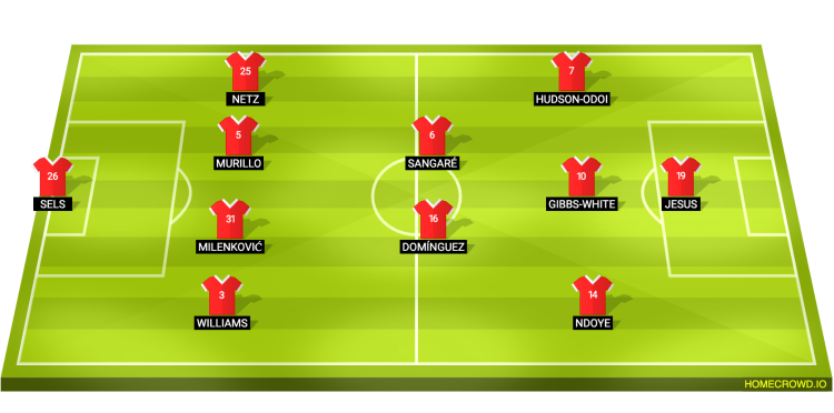 Probable Lineup (4-2-3-1): Sels; Williams, Milenkovic, Murillo, Netz; Domínguez, Sangare; Ndoye, Gibbs-White, Hudson-Odoi; Jesus
