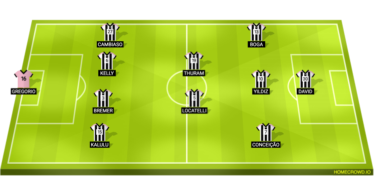 Probable Lineup (4-2-3-1): Di Gregorio; Kalulu, Bremer, Kelly, Cambiaso; Locatelli, Thuram; Conceicao, Yildiz, Boga; David