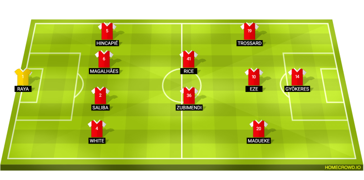 Probable Lineup (4-2-3-1) – Raya; White, Saliba, Gabriel, Hincapie; Zubimendi, Rice; Madueke, Eze, Trossard; Gyokeres