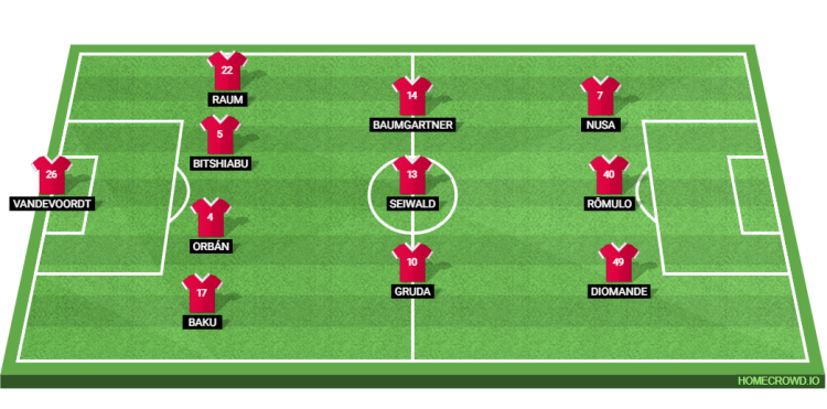 Probable Lineup (4-3-3): Vandevoordt; Baku, Orban, Bitshiabu, Raum; Gruda, Seiwald, Baumgartner; Diomande, Romulo, Nusa
