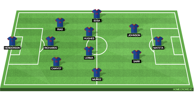 Probable Lineup (3-4-2-1): Henderson; Canvot, Richards, Riad; Munoz, Lerma, Hughes, Sosa; Sarr, Johnson; Mateta