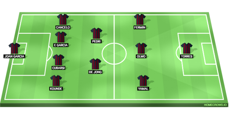 The Catalan giants will stick with the 4-2-3-1 formation, where Joan Garcia will be in goal. Jules Kounde and Joao Cancelo will feature as the full-backs. Meanwhile, Pau Cubarsi will pair up with Eric Garcia at the heart of the defence.