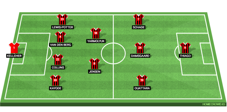 Probable Lineup (4-2-3-1): Kelleher; Kayode, Van den Berg, Collins, Lewis-Potter; Jensen, Yarmolyuk; Ouattara, Damsgaard, Schade; Thiago