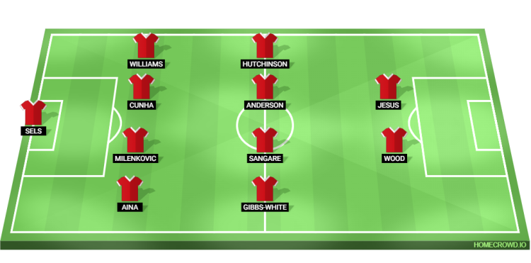 Probable Lineup (4-4-2): Sels; Aina, Milenkovic, Cunha, Williams; Gibbs-White, Sangare, Anderson, Hutchinson; Wood, Jesus