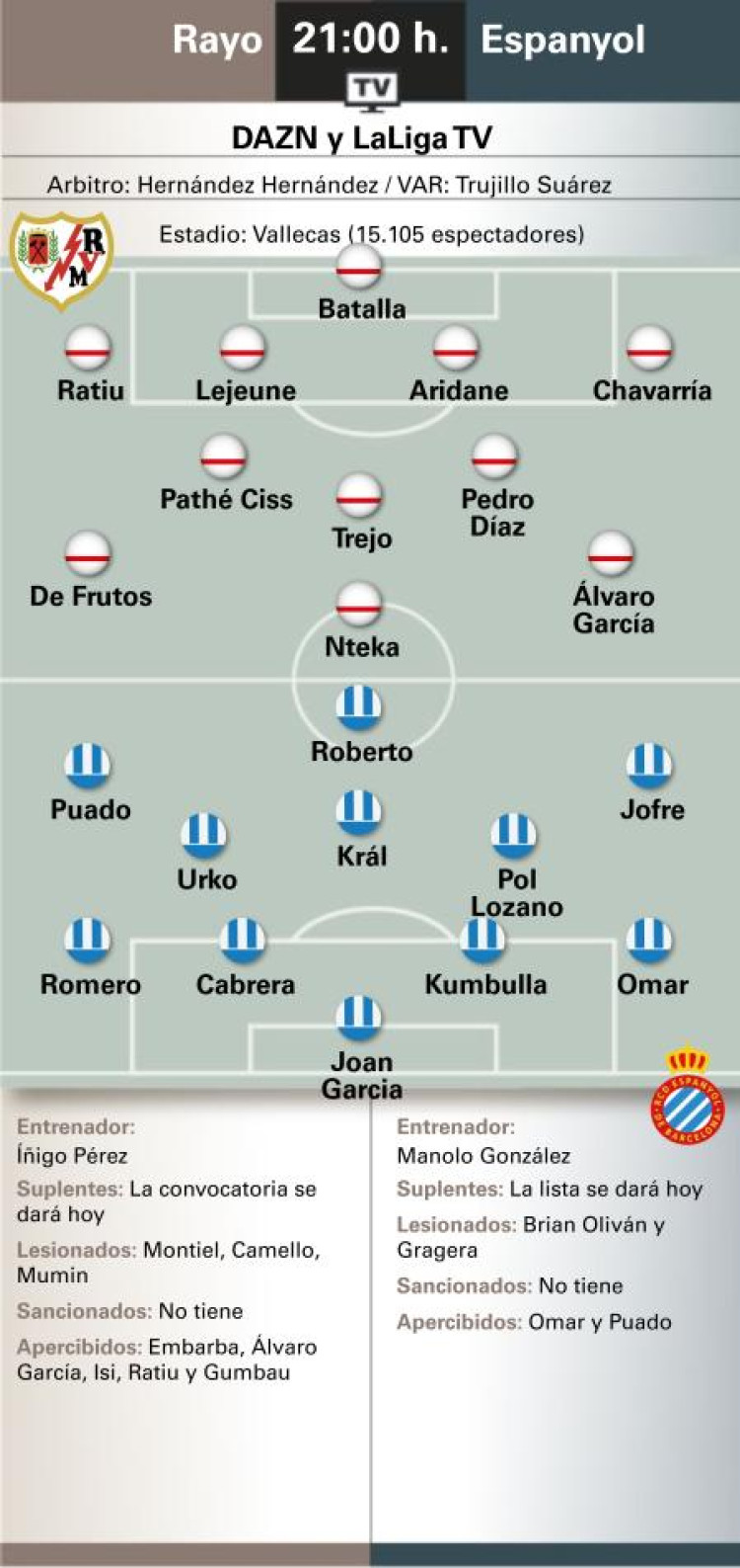 El técnico del Rayo Íñigo Pérez recupera a Lejeune, mientras que Nteka apunta a ser el ‘9’. Sin embargo no se descarta que Raúl de Tomás, que ya entró en la anterior convocatoria, repita hoy y pueda tener minutos ante su ex equipo. “Será un partido cerrado en el que nosotros tendremos que elaborar juego para hacer la diferencia”, dijo ayer Íñigo Pérez.