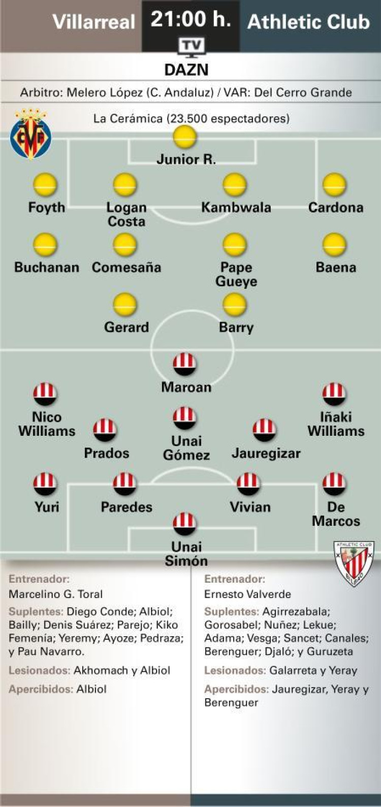Alineaciones probables en el Villarreal-Athletic