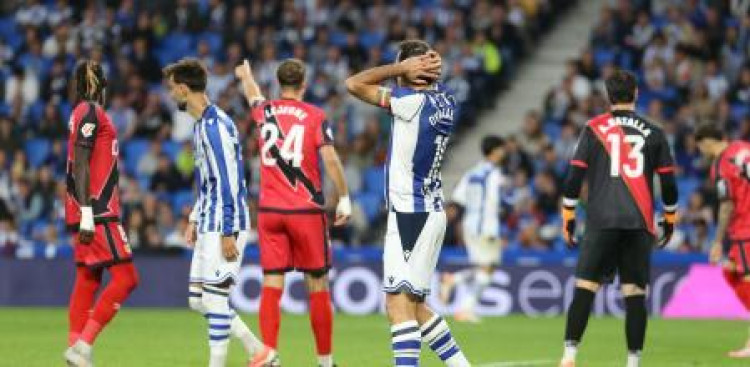 El partido era vita y la situación de ambos equipos, complicada y delicada. Debía verse un inicio fulgurante de energía pero no fue tal ni sobre el verde ni en la grada. La primera mitad fue un somnífero para casi cualquiera en una tarde de domingo. Sólo la ocasión de lejos de Guedes y el error de Gorrotxa que casi acaba en gol despertó momentáneamente al estadio. Eso, y la roja no sacada a Lejeune que hubiese cambiado todo en el minuto 4. Se protestó poco para lo clara que era, bastante más que la de Huijsen sobre el mismo Oyarzabal, aunque similar en características. El capitán le ganó la partida al central del Rayo en un balón dividido en el centro del campo cuando el galo era el último jugador. Ya se iba sólo el ‘10’ hacia Batalla, por la parte central y con el balón controlado además, pero José Luis Guzmán no señaló ni falta en la ‘cazada’ que le pegó Lejeune al realista, muy clara. Necesitó asistencia médica el eibartarra, pero ni en ese tiempo le mandó revisarlo el encargado del VAR, un viejo conocido y no por sus buenas dotes arbitrales precisamente, Pablo González Fuertes. Pasó casi como si nada cuando era una acción clave y un error evidente. Coincidió con la entrada a la grada de Bultzada, que había protestado durante cinco minutos por el genocidio en Palestina, pero no fue aliciente para apretar al árbitro.
