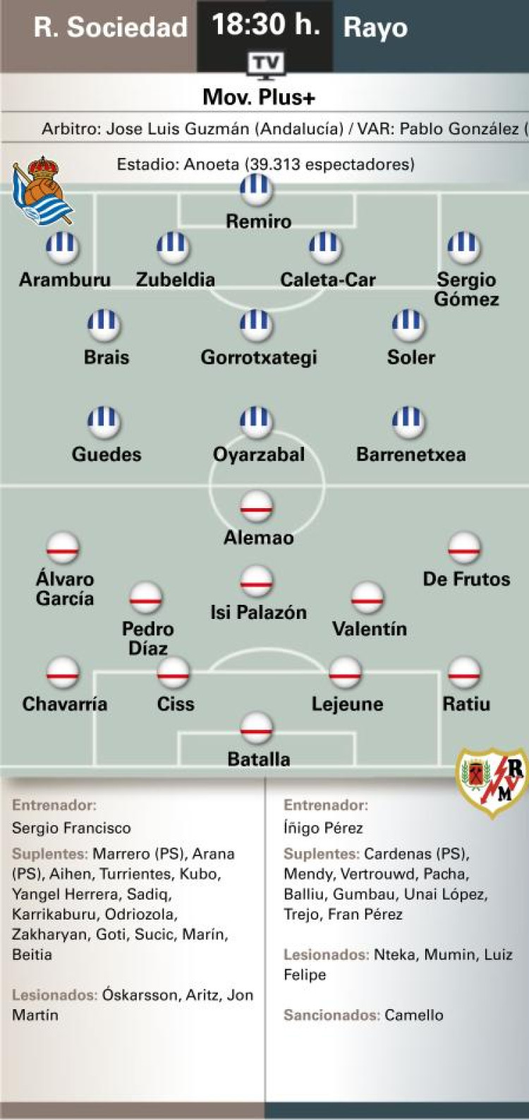 La Real Sociedad tiene ante sí esta tarde una prueba de fuego total contra el ‘EuroRayo’ de Iñigo Pérez. Porque debe traducir en puntos y dar continuidad a las mejoras notables en distintos aspectos que se vieron la semana pasada en ataque y en defensa, porque se enfrenta a un rival con los mismo puntos, porque juega en casa y porque están en posiciones de descenso y todo lo que sea no ganar por segunda vez antes del segundo parón sería un revés importante. De hecho, la victoria del Girona ante el Valencia le ubicó en la penúltima plaza y luego sólo una victoria muy sufrida del Athletic contra el Mallorca evitó que los txuri urdin llegasen al vital partido de hoy como colistas, lo que hubiese sido una presión añadida. Es otra final, aunque sea diferente a la del miércoles pasado. Las dudas y urgencias son más clasificatorias ahora que de sensación o de juego, sin que esto último sea tampoco ya una certeza, pero la victoria sigue resultando fundamental, casi innegociable para no vivir un parón eterno. No será fácil porque el Rayo es un buen equipo, trabajado, que viene con subidón moral por ganar en Europa, pero también con menos descanso y preparación, algo que deben aprovechar los de Sergio.