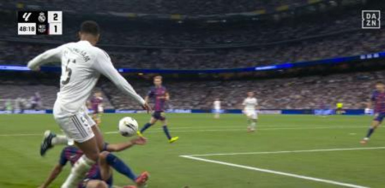 En una acción en la que Bellingham encaró por la banda derecha a Eric Garcia, dentro del área, el balón tocó en la mano del central azulgrana tras un rebote en la pierna del inglés. Inicialmente el colegiado no lo consideró penalti pero Iglesias Villanueva le llamó para revisarlo en la banda y una vez acudió a la pantalla y vio varias repeticiones decretó pena máxima.